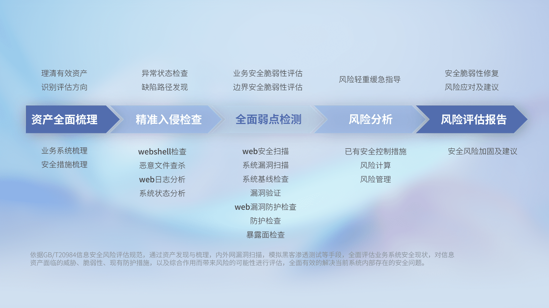 针对客户行业特性,,,以专业的安全服务+多厂商联合解决方案提供专属的一站式安全管理服务,,,帮助客户全面感知网络空间威胁,,,,基于识别、、、、检测、、分析、、、防护、、监测、、响应的服务理论模型,,从方案咨询、、、集成交付、、、评估验证、、优化加固、、、运维运营,,,,致力于为客户提供完整的闭环管理式安全服务。。。以实战经验为客户打造高抵御风险的安全体系,,,,帮助客户发现威胁、、、、对抗威胁、、处置威胁,,,,不断积累安全对抗能力,,,持续保障数字化安全。。。。