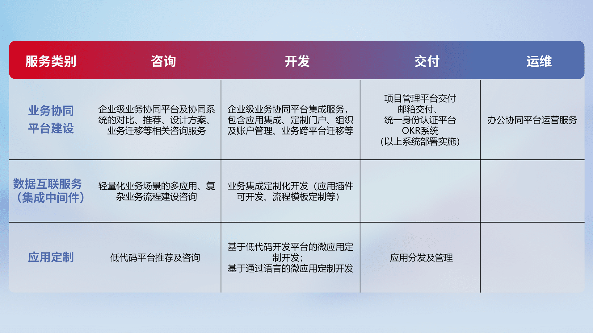 针对钉钉、、、、企微、、、、IDaas等平台级产品提供产品的规划、、、、方案、、、交付、、、、定制化开发等服务,,,,实现如统一协同办公、、、、智能客户服务、、、混合会议管理、、、智能数据查询、、、等业务场景,,,,实现数字化转型。。